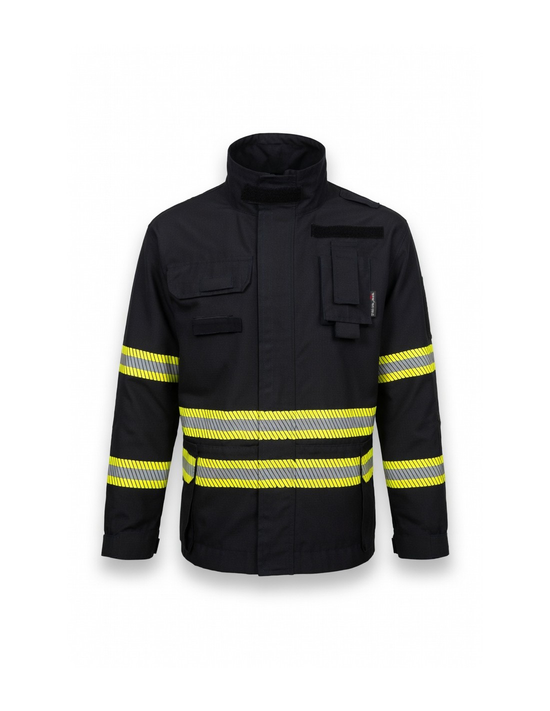 Die Jacke ist bequem und hergestellt aus hochwertigem Material - Oberbekleidung – und hat gewöhnliche, lange Ärmel. An den Ärmelsaum gibt es Klettverschlüsse, um die Weite zu regulieren. Die Ärmel sind durch zwei Materiallagen verstärkt. In Brusthöhe gibt es auf der linken Seite eine Radiotasche, über ihr eine Mikrofonlasche und auf der rechten Seite eine Lampentasche. In der Taillenhöhe vorne gibt es noch zwei praktische Taschen, innerhalb der linken Tasche befindet sich ein D-Ring. Beide Taschen sind durch Reflexstreifen zusätzlich betont. Die Reflexstreifen können noch zweimal um den Körper gewickelt werden.