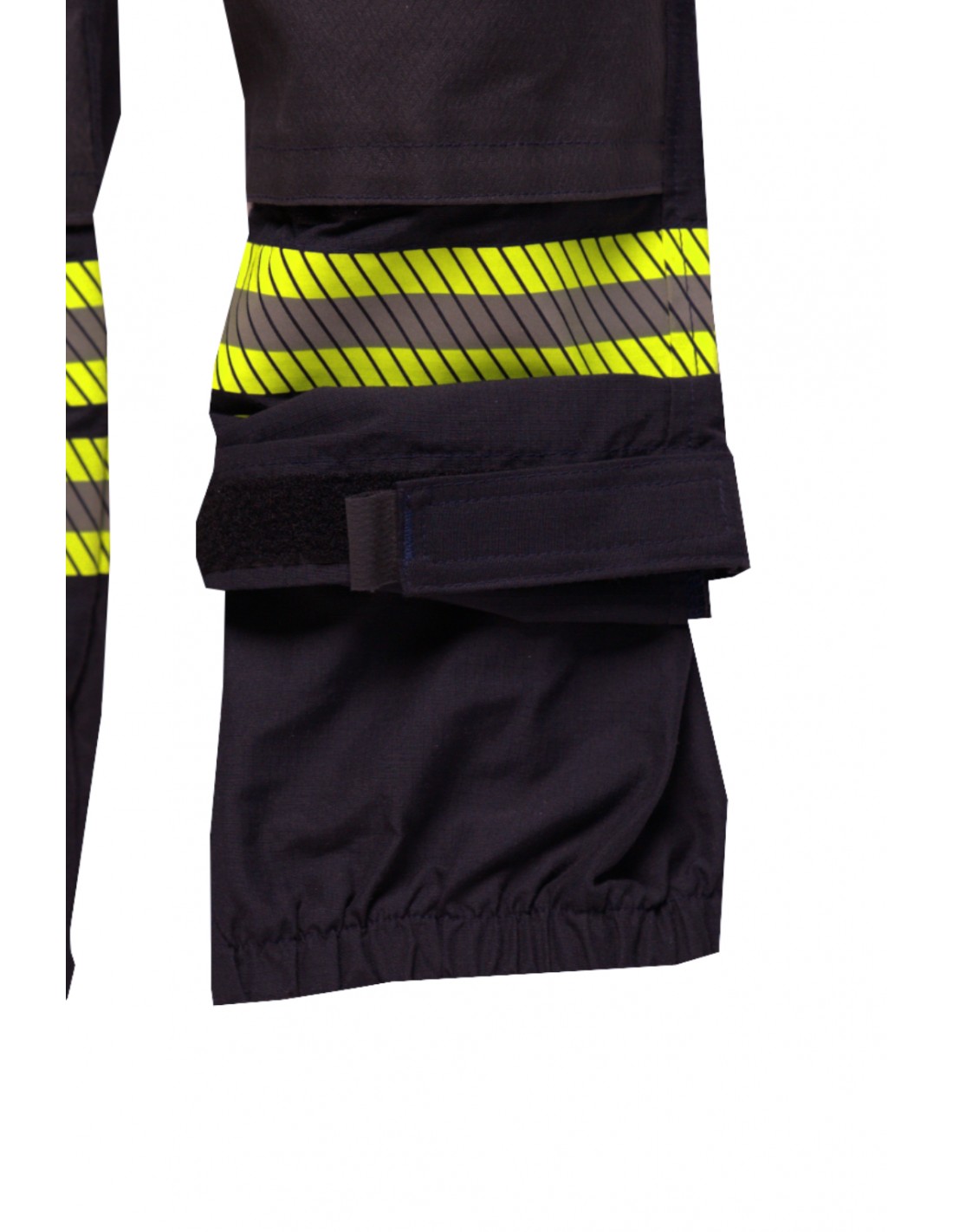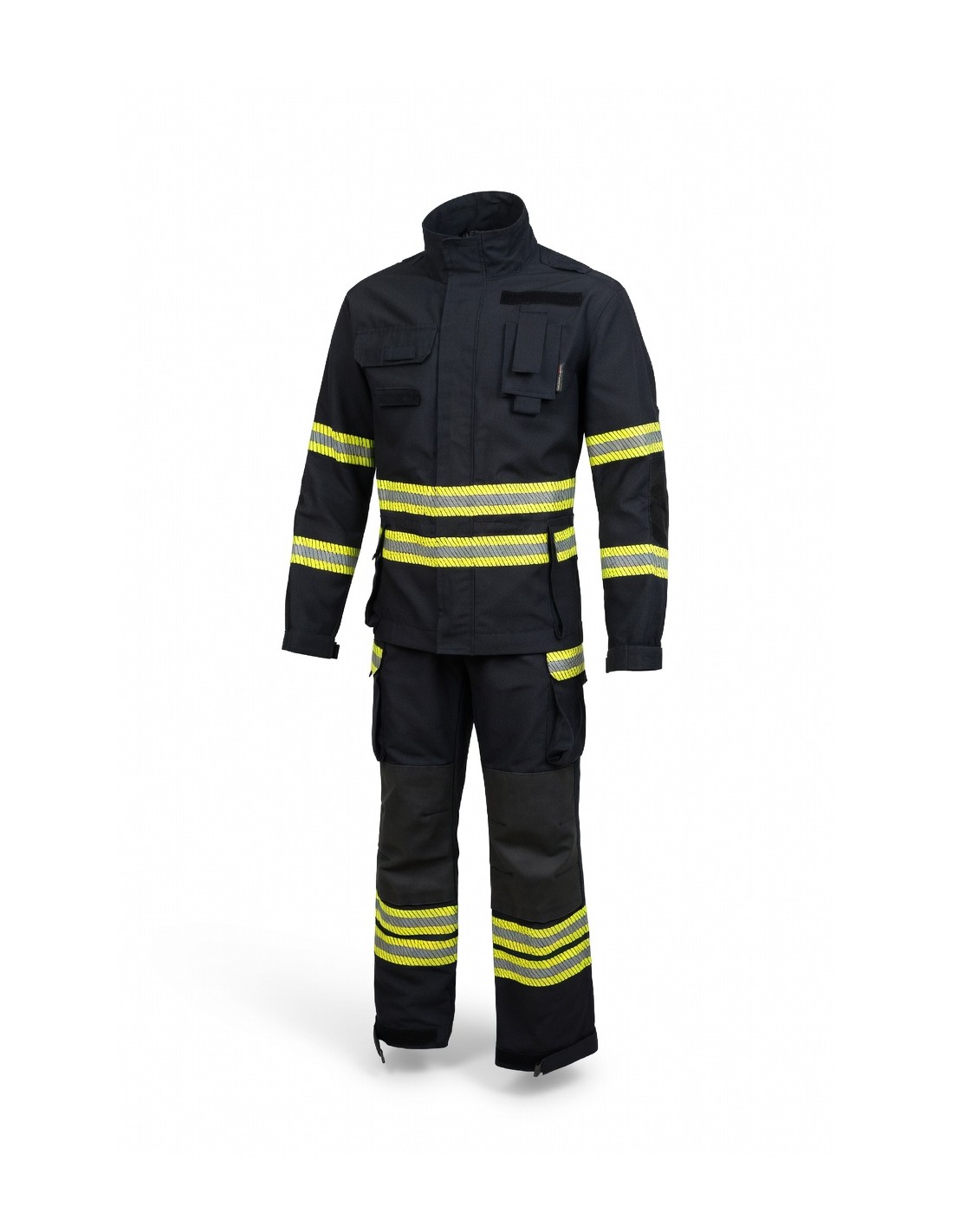 Jacket is a comfortable garment that you wear over under layer clothes. It has a type of regular long sleeve. The end of the sleeves can be regulated with Velcro straps. Elbows are reinforced with two layers of material. At chest height, it has a pocket on the left side, for the radio, that closes with a Velcro strap and above the pocket a loop for radio microphone. On the right side there is a loop for flashlight that can be adjusted with Velcro straps. On the front lower side of the jacket we have another pair of pockets that closes with Velcro straps. In the left pocket there is a D-ring. The pockets have a reflective tape for better visibility, reflective tape goes also twice around both sleeves and twice around firefighters body. On the inner side of the jacket there is a zipper that can connect jacket with trousers, so it can be worn like an overall.